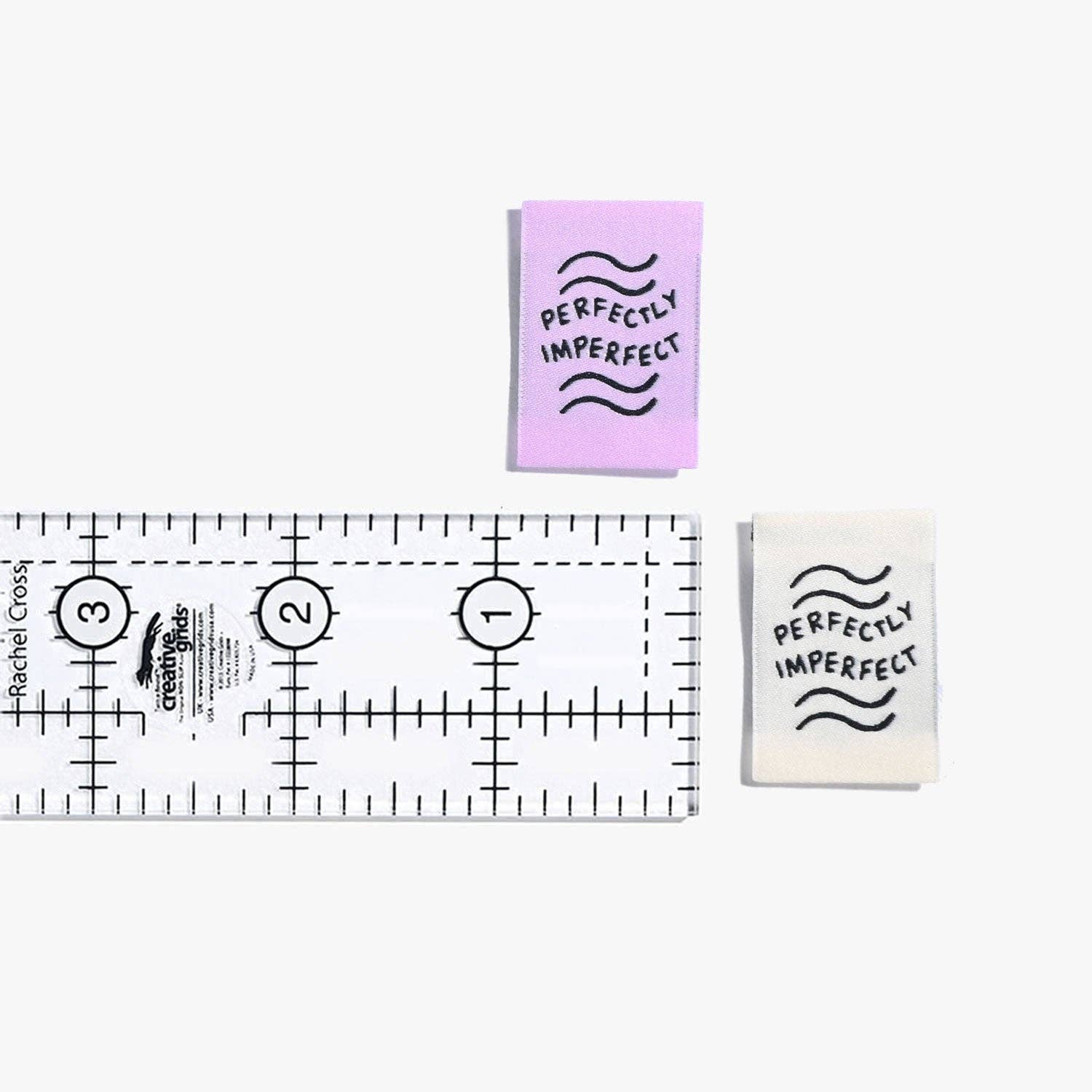 Download Perfectly Imperfect Images It's back, baby! Our third and latest version of our beloved OG 'Perfectly Imperfect'! Now in our vertical end fold label format, keeping it versatile and fresh. With a dreamy aesthetic, the chill vibe of our new 'Perfectly Imperfect' label encapsulates the sentiment perfectly (If not perfectly imperfectly ☺️). Format: Case of 6 Units (1 unit = 1 pack of 6 labels) Included in a pack: 6 labels per pack (3 x Lilac + 3 x Ivory) Ivory with Black Text, Lilac with Black Text Dimension: 24mm x 45mm Label types: Vertical end fold Material & HS Code: Polyester woven labels 580710 How to attach: End fold labels are ideally sewn onto the garment (Either inside or displayed visibly) by top stitching each end. Watch our How To: Add Labels video here. Designed in Australia by Kylie and The Machine Made in China.
