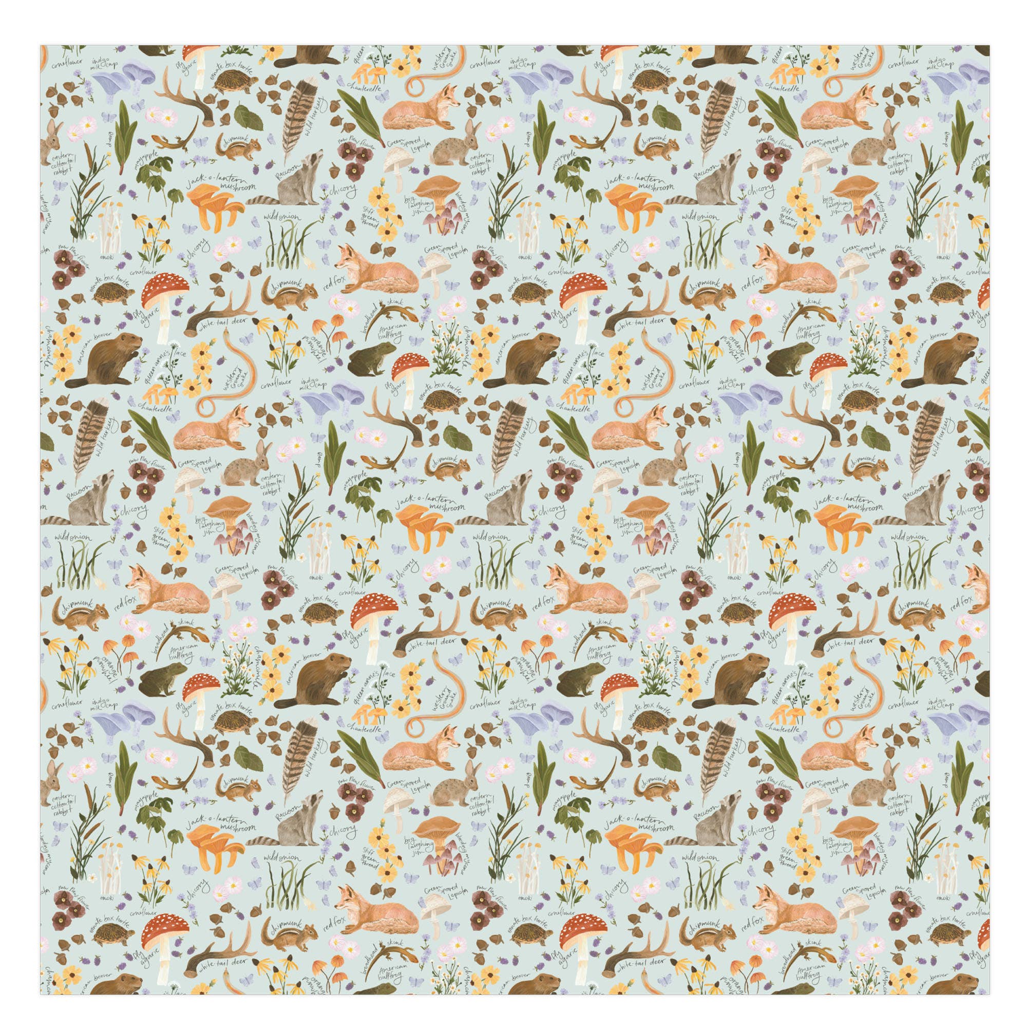 Envelop your baby in the gentle beauty of nature with the Flora & Fauna Swaddle. It features a variety of beautifully hand-painted animals, flowers and plants such as mushrooms, blackberries, coneflowers, chamomile, a turtle, fox, raccoon, beaver, frog, snake, chipmunk, lizard and more. This swaddle is crafted for softness and breathability, providing a cozy and stylish layer for your little one. Give the gift of comfort and style to any new mom for the baby shower, welcoming a new arrival, or Mother's Day. Features | Bamboo-cotton blend fabric Material | 70% bamboo rayon, 30% muslin cotton Size | 47" x 47" Printing | Digital