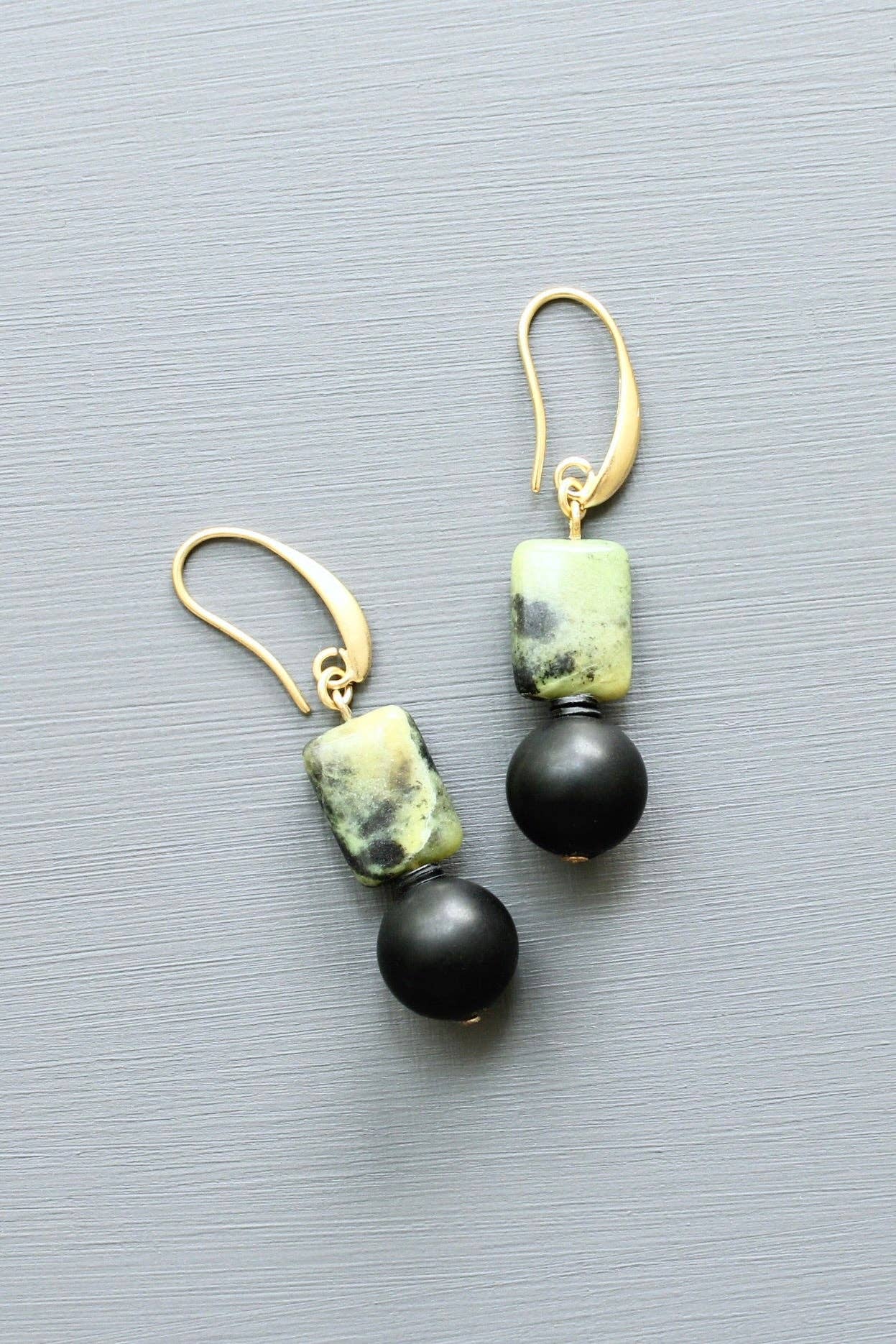 Gold plated brass hook earrings with green jasper and matte jet glass. Each earring measures 2 inches.
