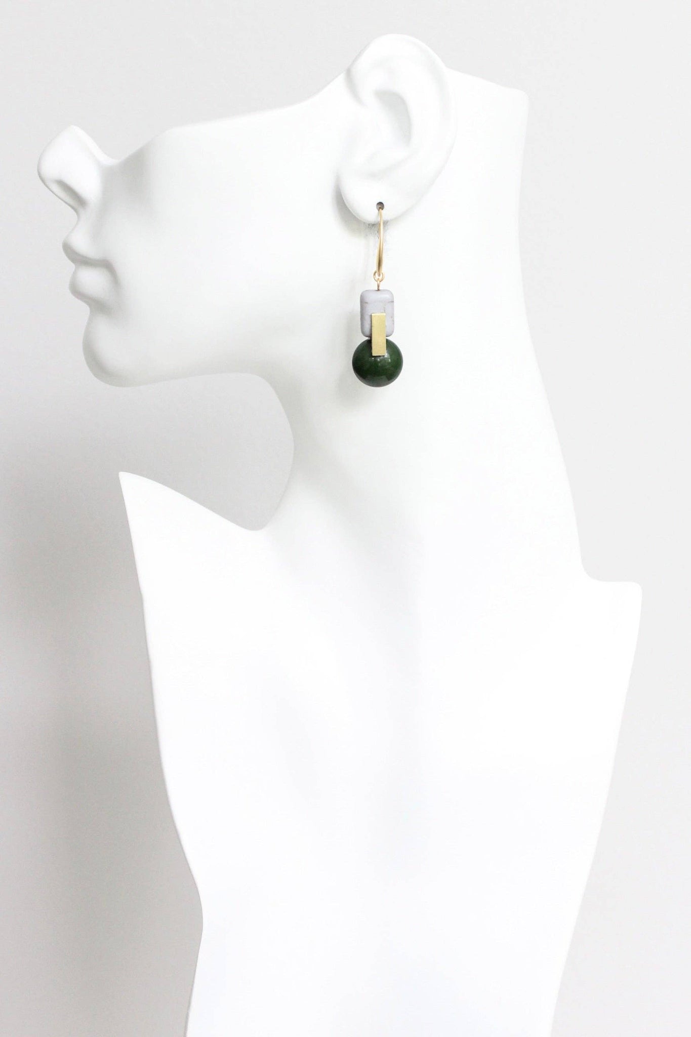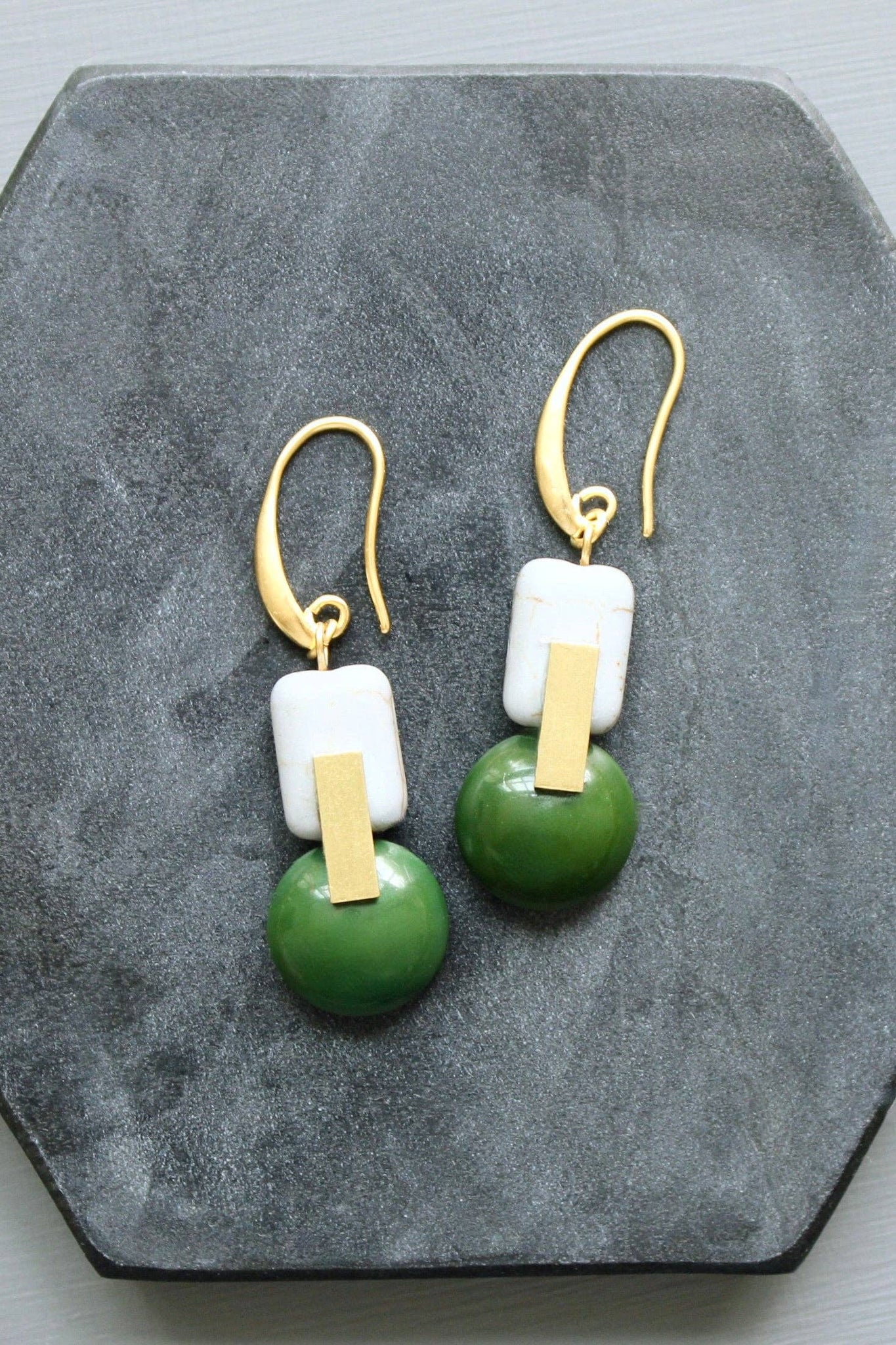 Gold plated brass hook earrings with hunter green glass and magnesite. Each earring measures 2.125 inches.