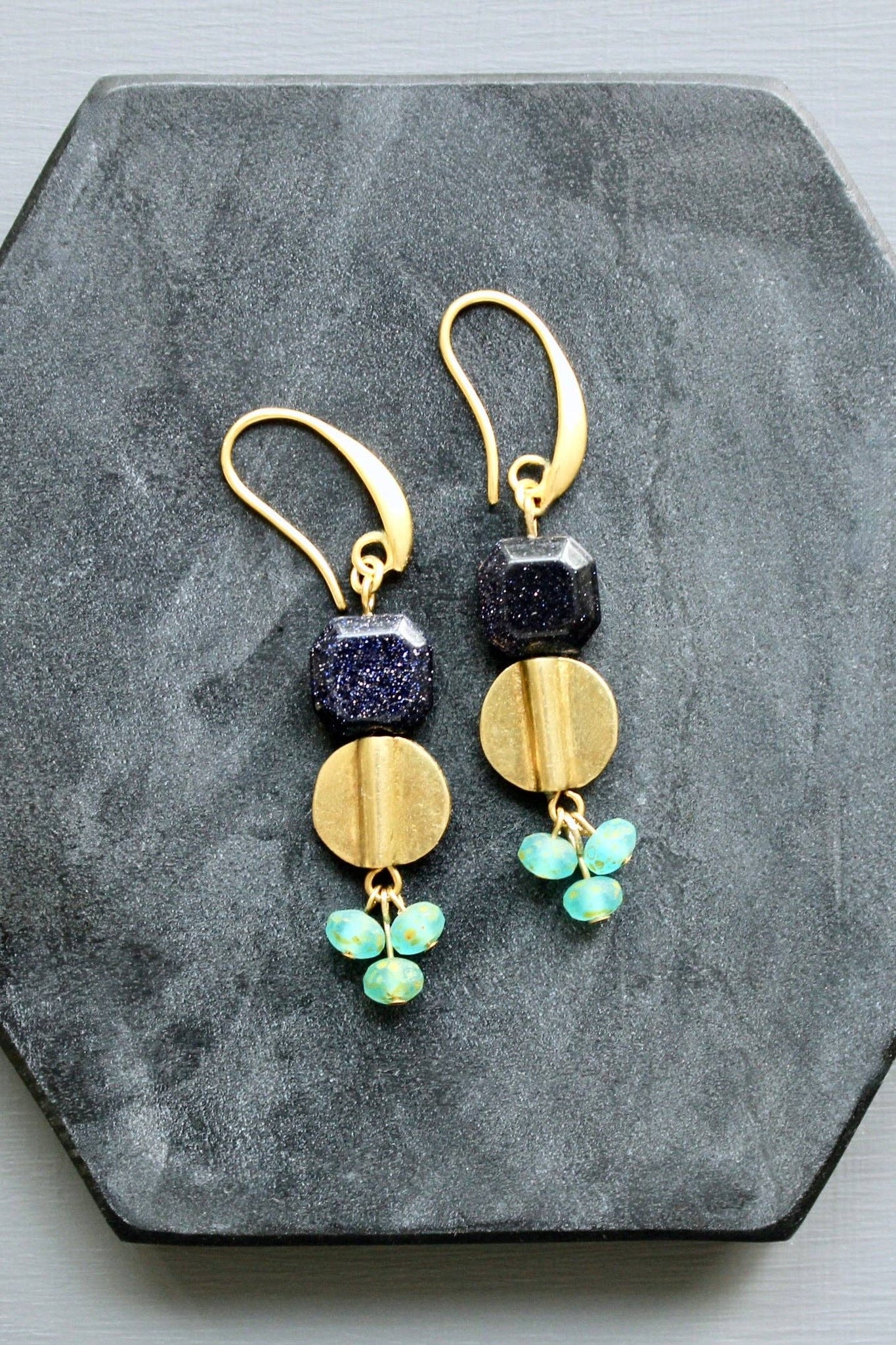 Gold plated brass hook earrings with blue goldstone and aqua glass. Each earring measures 2.25 inches.