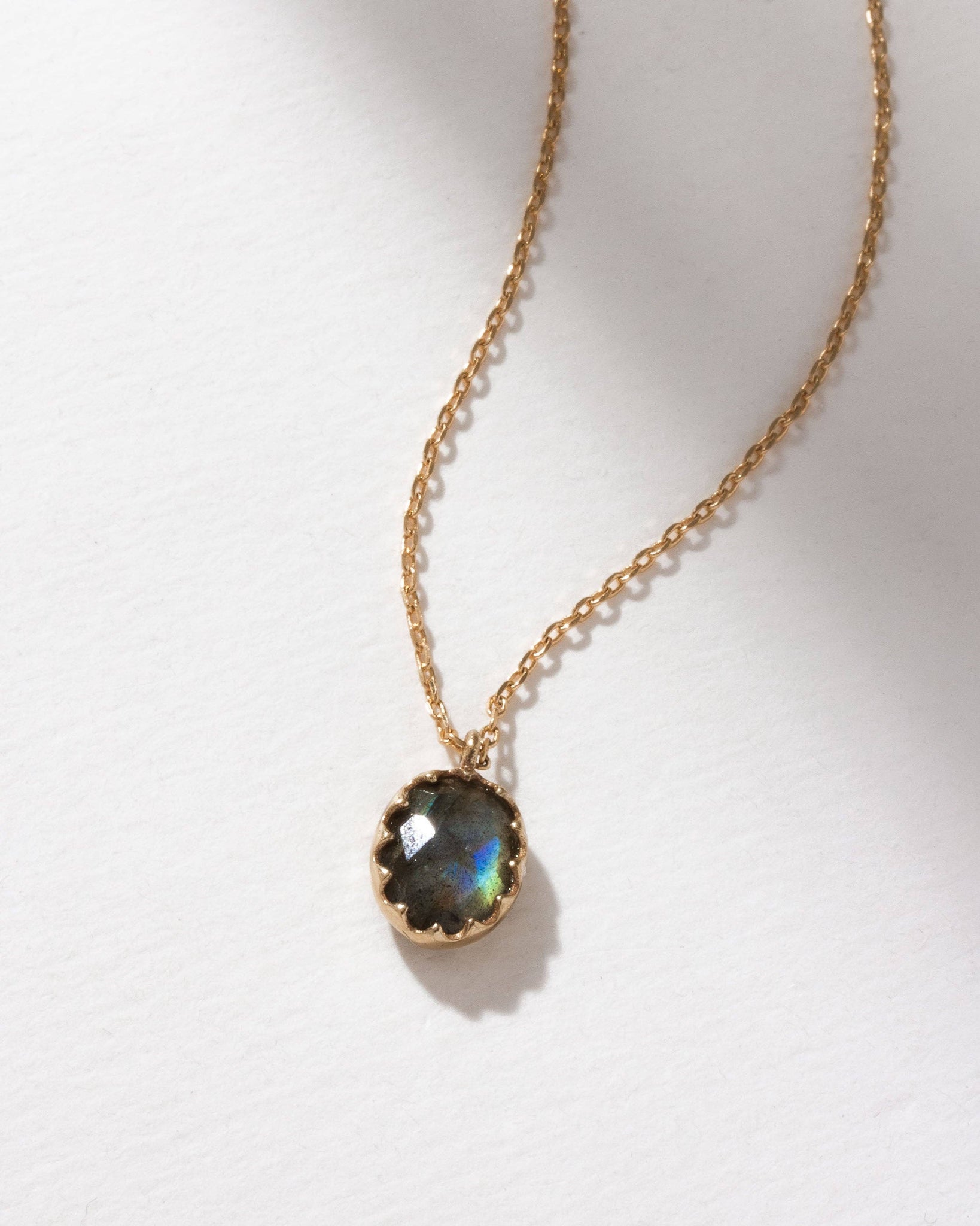 Featuring a hand-faceted labradorite gem renowned for their enchanting play of colors, this dainty necklace is perfect for adding a touch of celestial charm to any jewelry collection.