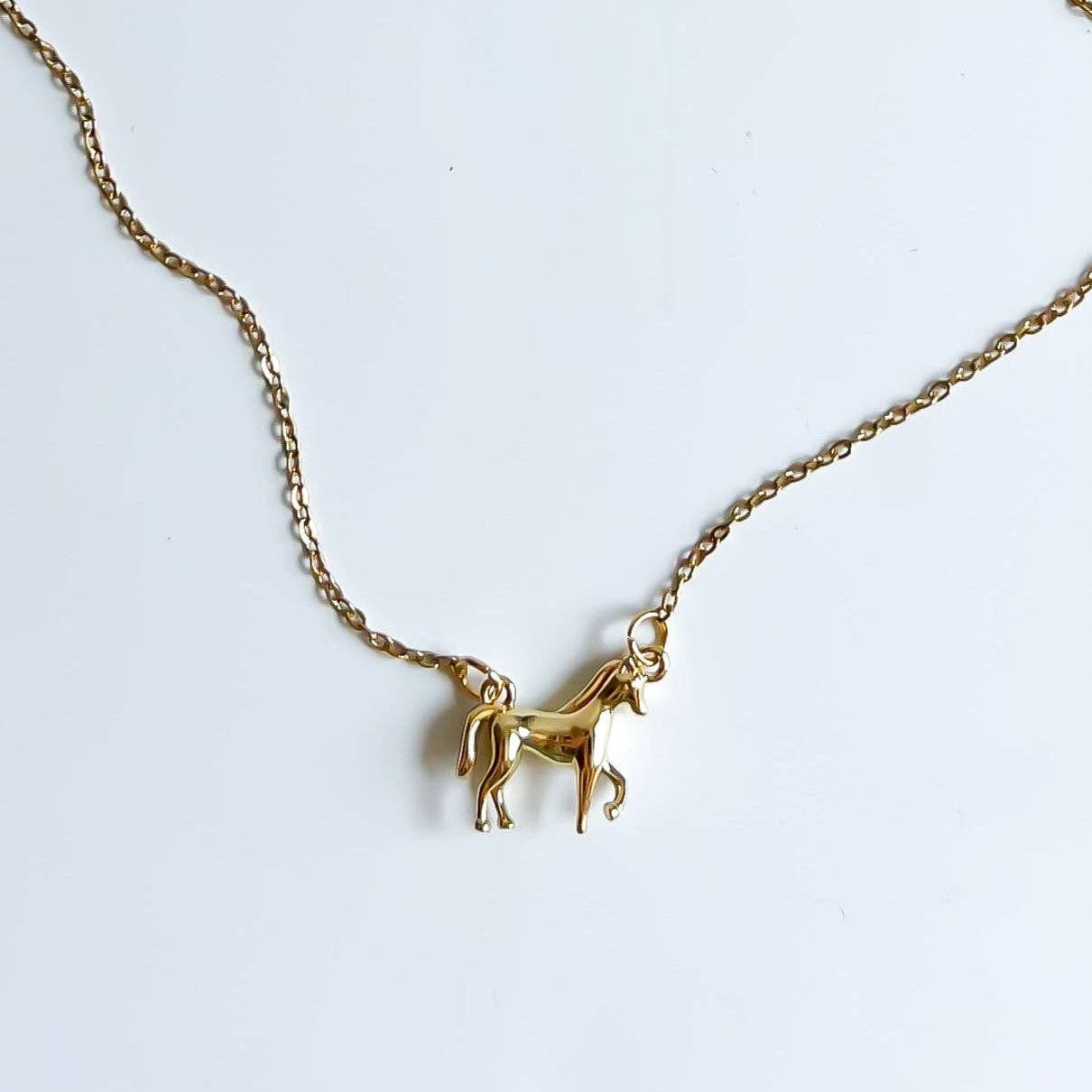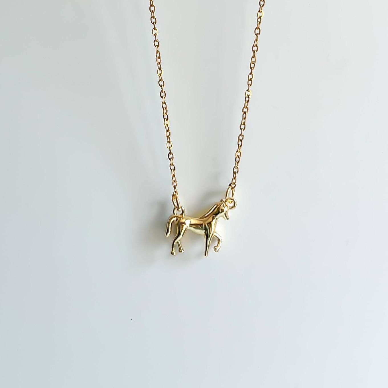 The Horse Girl Necklace features a finely crafted 14k gold-plated brass horse pendant, paired with a durable 18-inch gold stainless steel chain with a lobster claw clasp.