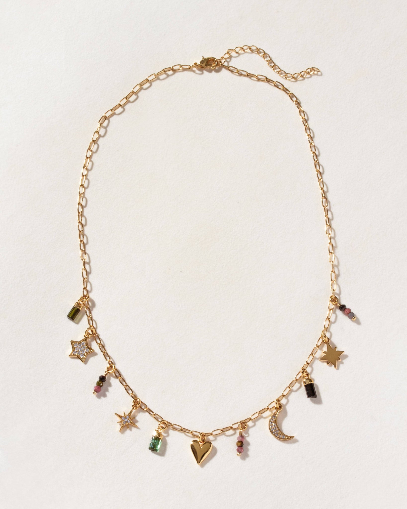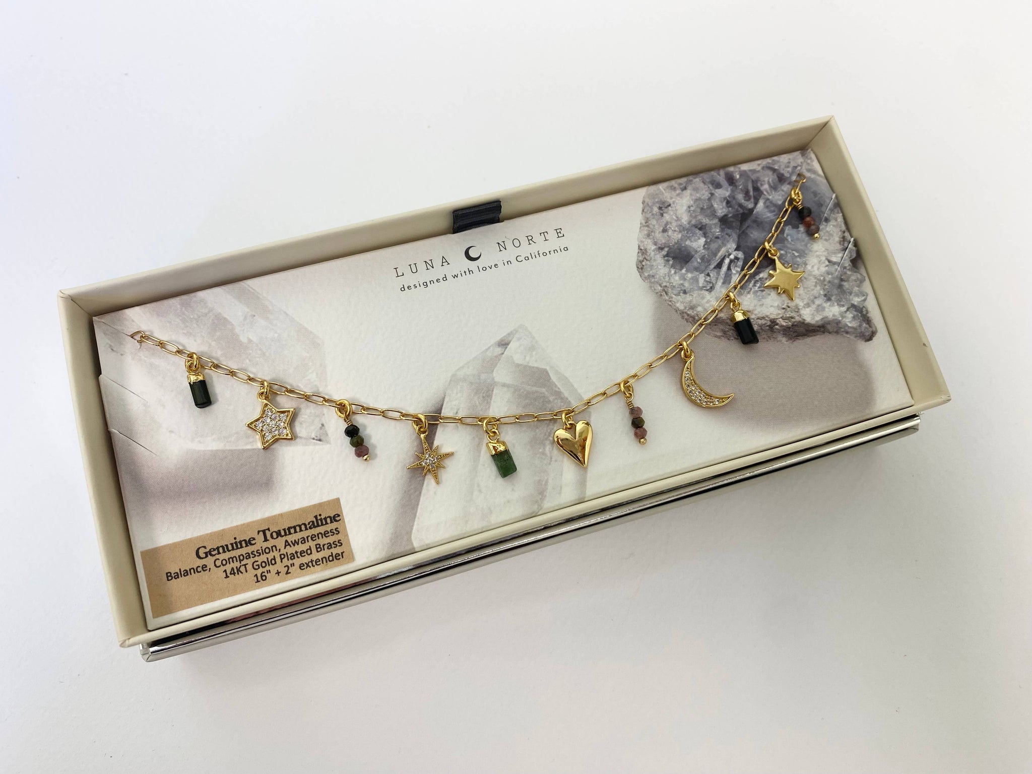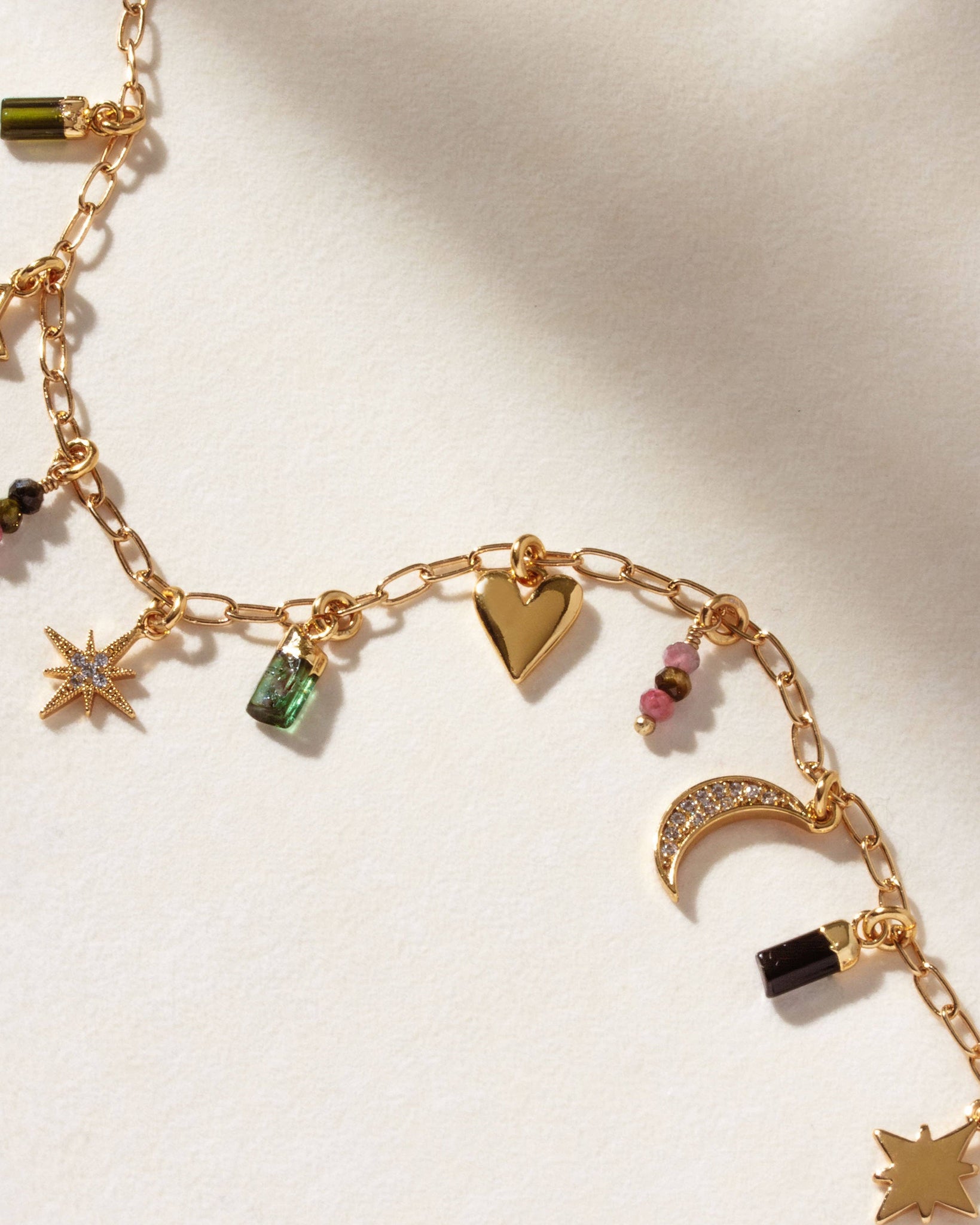 At its heart, a delicate heart charm steals the spotlight, framed by signature celestial accents that add a dreamy, cosmic touch. Lightweight yet statement-worthy, this necklace layers beautifully and appeals to customers seeking joyful, trend-forward pieces with a hint of magic. While tourmaline is October’s birthstone, its appeal is truly seasonless—because something this delightful deserves to shine every day.