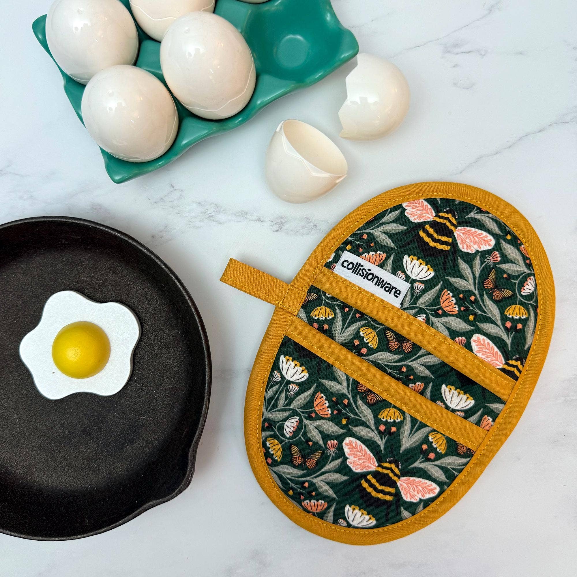 Bumble Bees, butterflies and flowers are placed on a dark green background with olive green lining and yellow/gold trim. Crafted with four layers of cotton batting, these mitts provide excellent heat resistance, making them perfect for baking, roasting, or handling hot dishes. Compact like a pot holder but with the convenience of an oven mitt. Dimensions: -Full size is 5 1/2" x 8". Each hand pocket is 3" x 4 1/2". Please note that the placement of the pattern may vary. Each order includes one pincher mitt, sold individually. Care Instructions: -Machine wash in cold or warm water, then tumble dry low or lay flat to dry. -Avoid using high heat during washing or drying to prevent shrinkage. Safety Note: -While these mitts are heat-resistant, they are not fireproof, so use caution around open flames.