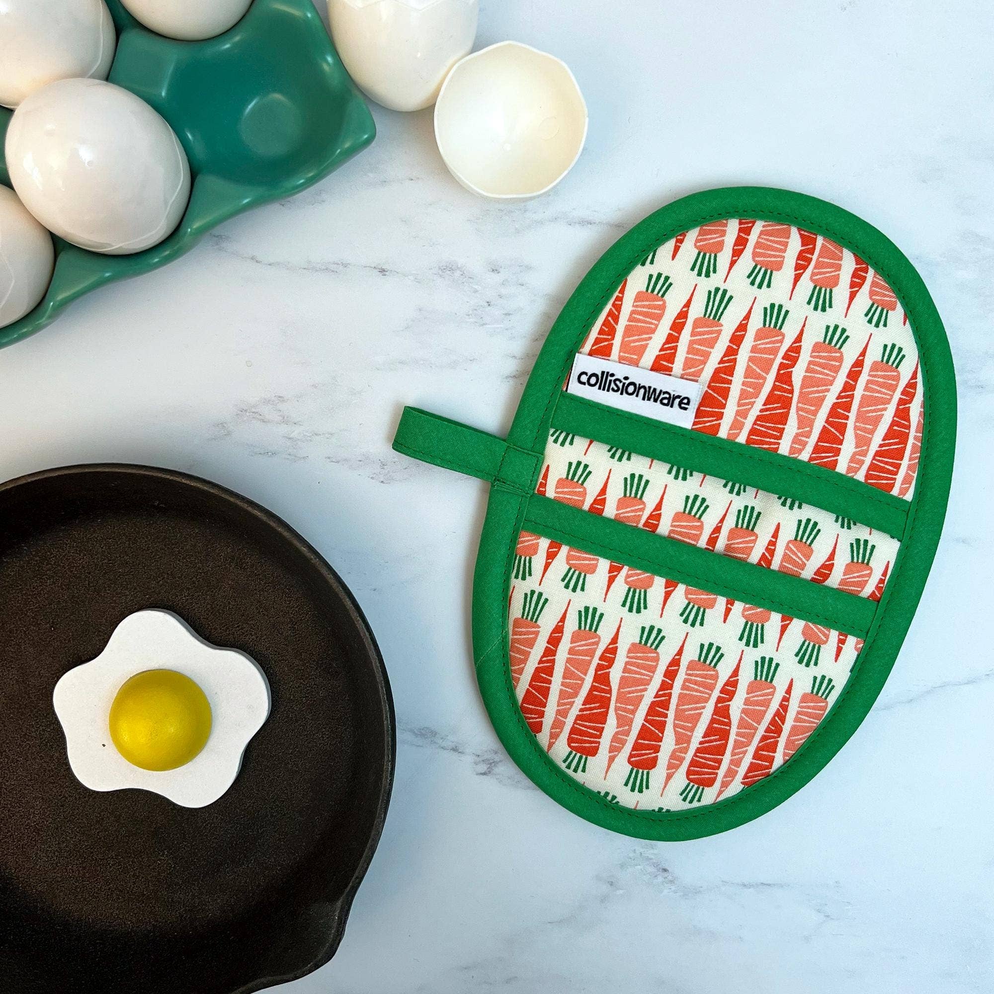 Rows of little carrots are set against a cream background, complemented by an emerald green lining and emerald green trim. Crafted with four layers of cotton batting, these mitts provide excellent heat resistance, making them perfect for baking, roasting, or handling hot dishes. Compact like a pot holder but with the convenience of an oven mitt. Dimensions: -Full size is 5 1/2" x 8". Each hand pocket is 3" x 4 1/2". Pattern placement may vary. Each order includes one pincher mitt, sold individually. Care Instructions: -Machine wash in cold or warm water, then tumble dry low or lay flat to dry. -Avoid using high heat during washing or drying to prevent shrinkage. Safety Note: -While these mitts are heat-resistant, they are not fireproof, so use caution around open flames.