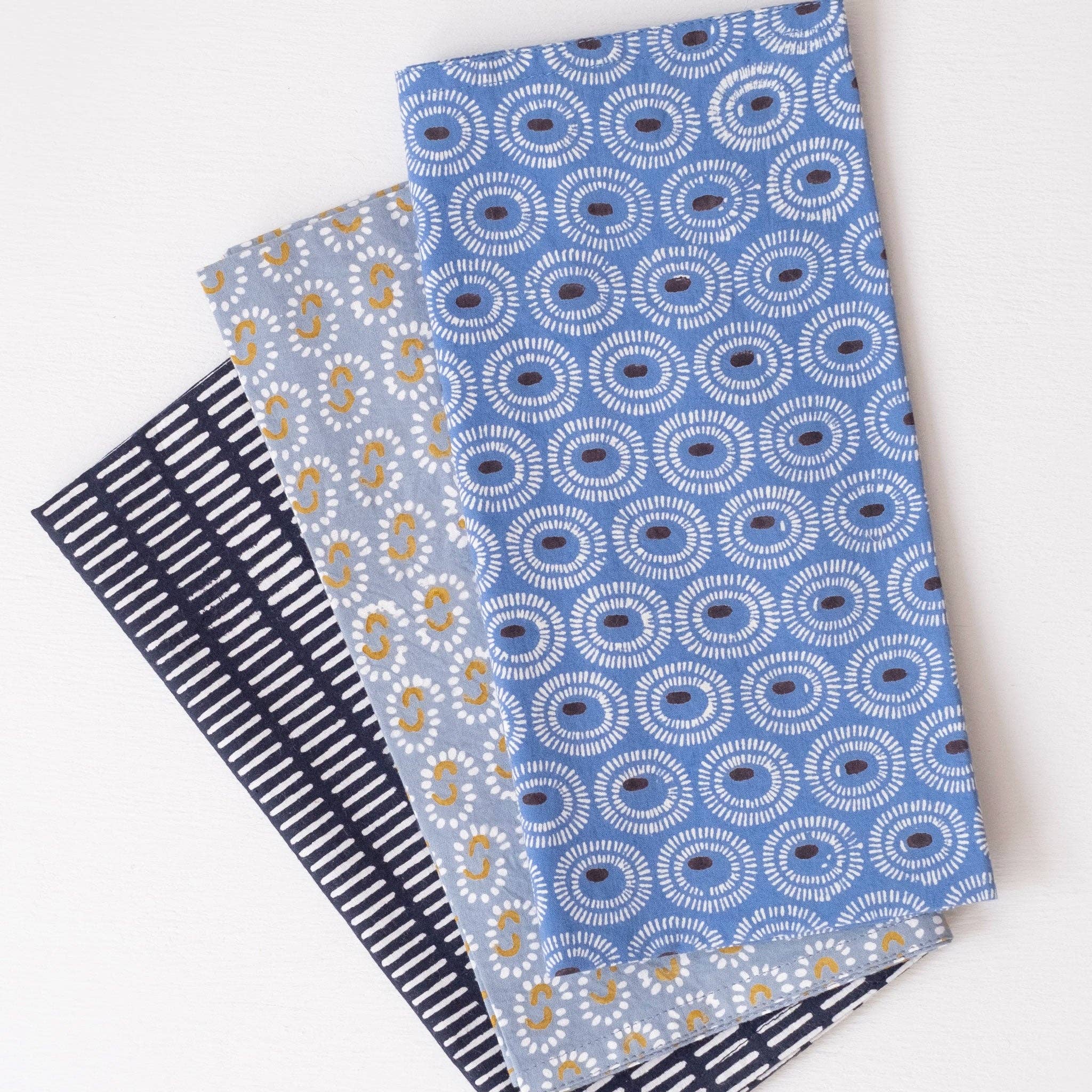 - Set of 4 Napkins - Our block printed napkins are fun, easy to care for and pair wonderfully with our tablecloths. An easy, eco friendly alternative to paper towels, they come in an array of designs that can be mixed and matched. We love using them for our casual everyday table, and also for fancier meals. About 20”x20” 100% Cotton Cambric Process Hand block-printed using non-toxic water based dyes Ethically crafted by our team in Jaipur Care Machine wash and dry on low