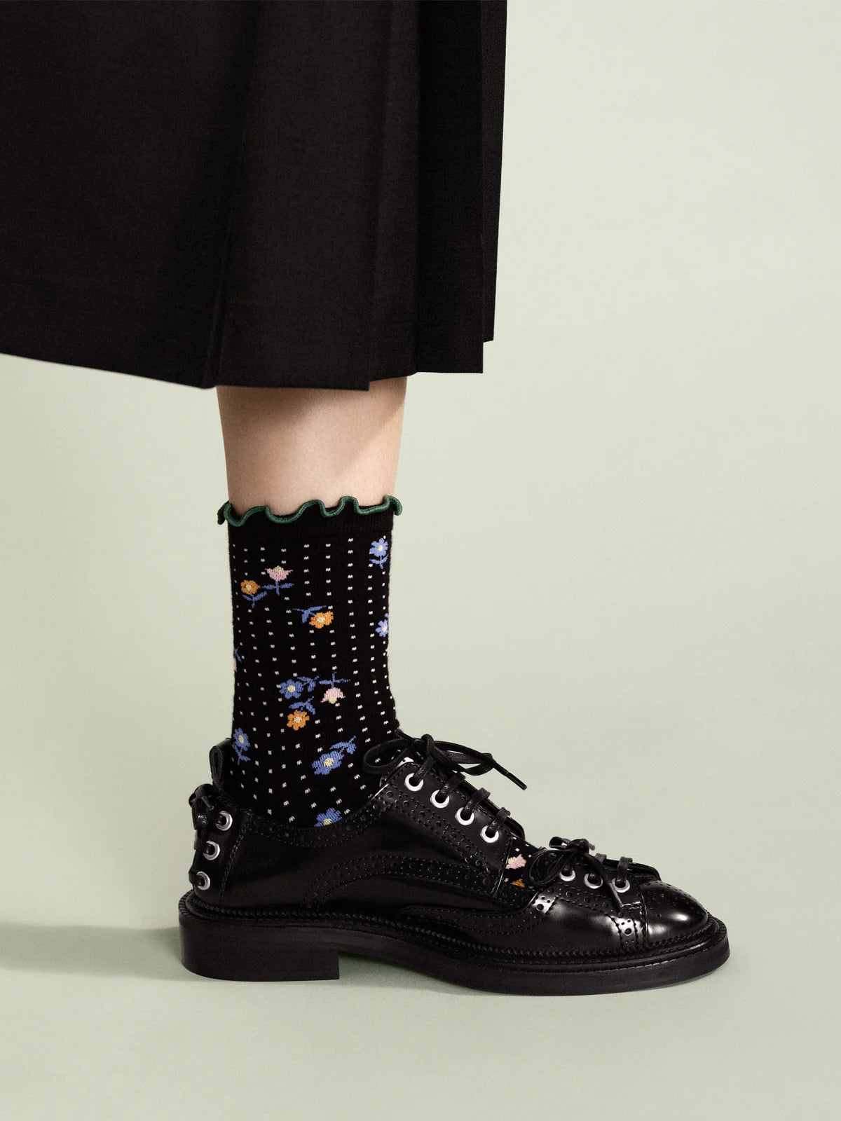 Get ready to be in full bloom with the Dottie Floral Crew. This stylish top features sweet cotton florals that pop against the dotted body. With a unique contrast stitched lettuce cuff, you'll be serving looks all day long!