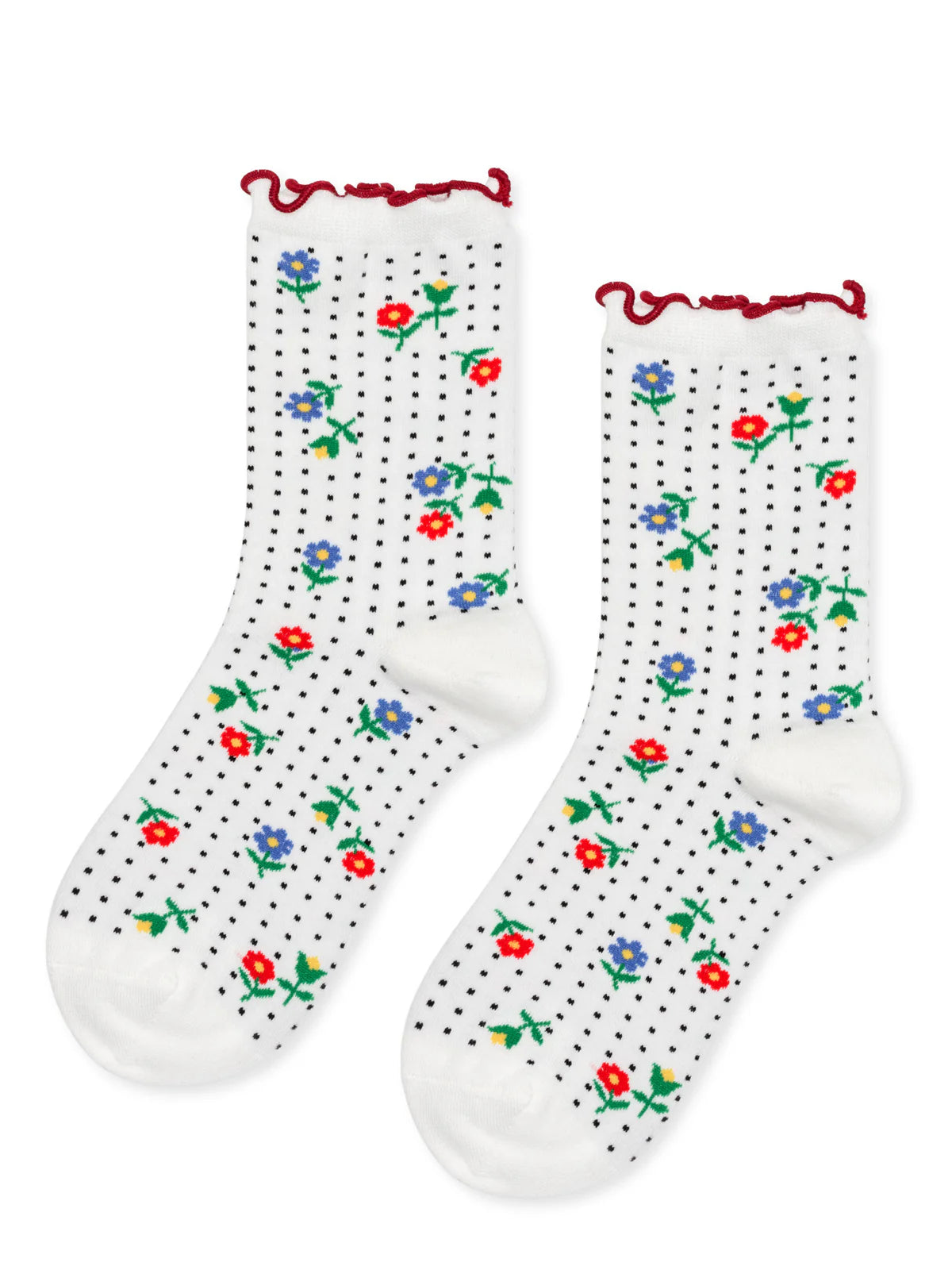 Get ready to be in full bloom with the Dottie Floral Crew. This stylish top features sweet cotton florals that pop against the dotted body. With a unique contrast stitched lettuce cuff, you'll be serving looks all day long!