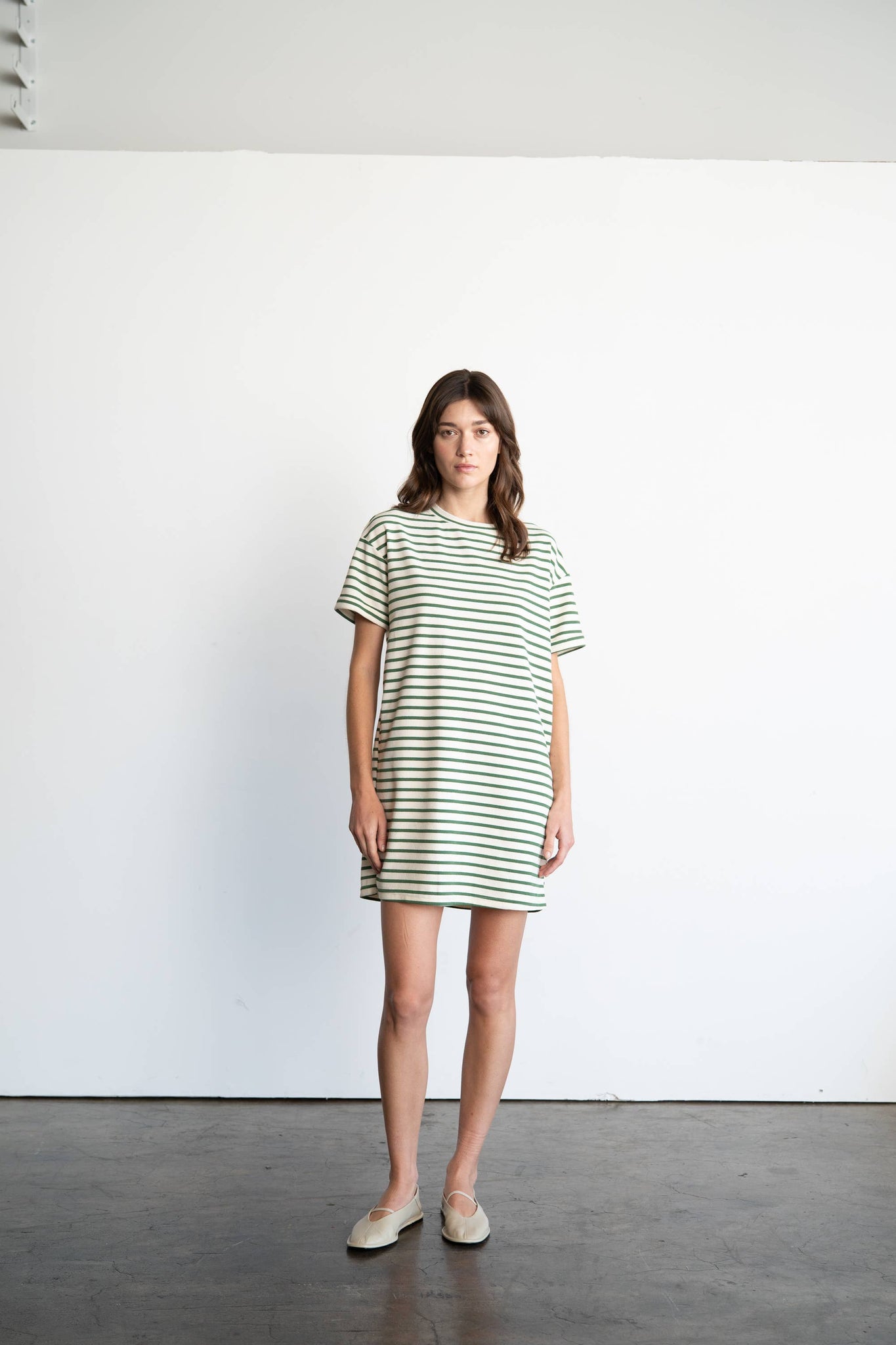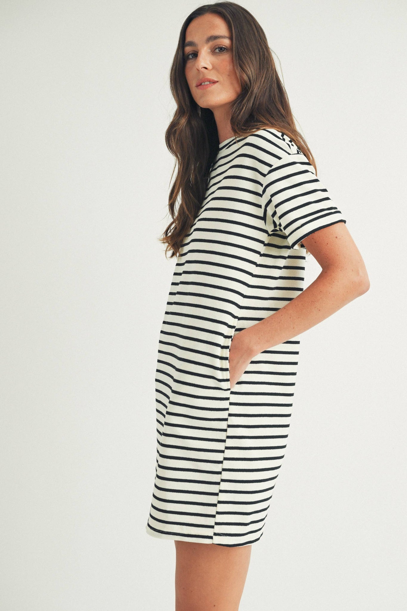 - Style #3126EDC - Mini length with an above-the-knee fit - Crew neckline - Short sleeves - Straight silhouette - Striped pattern - Side pockets