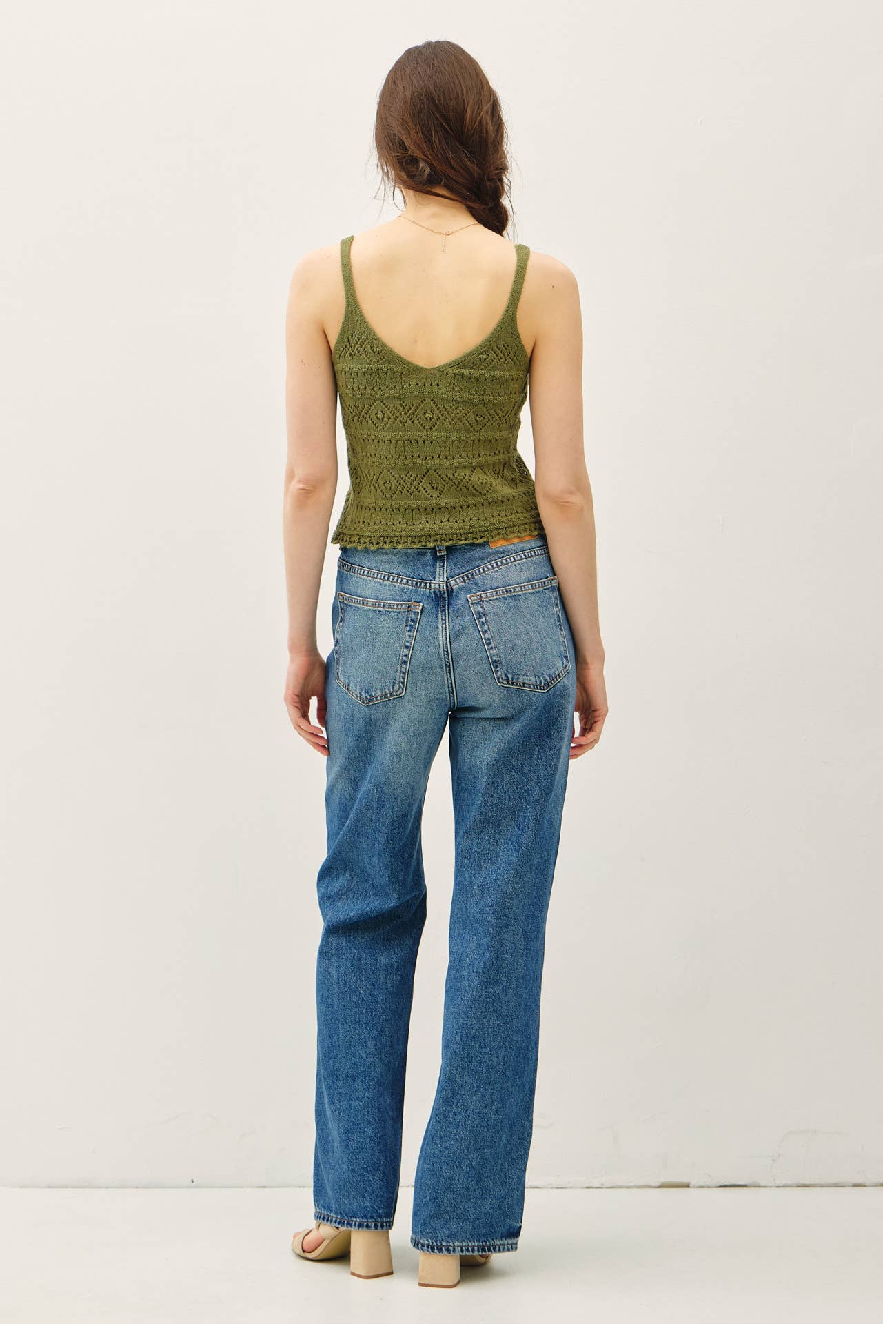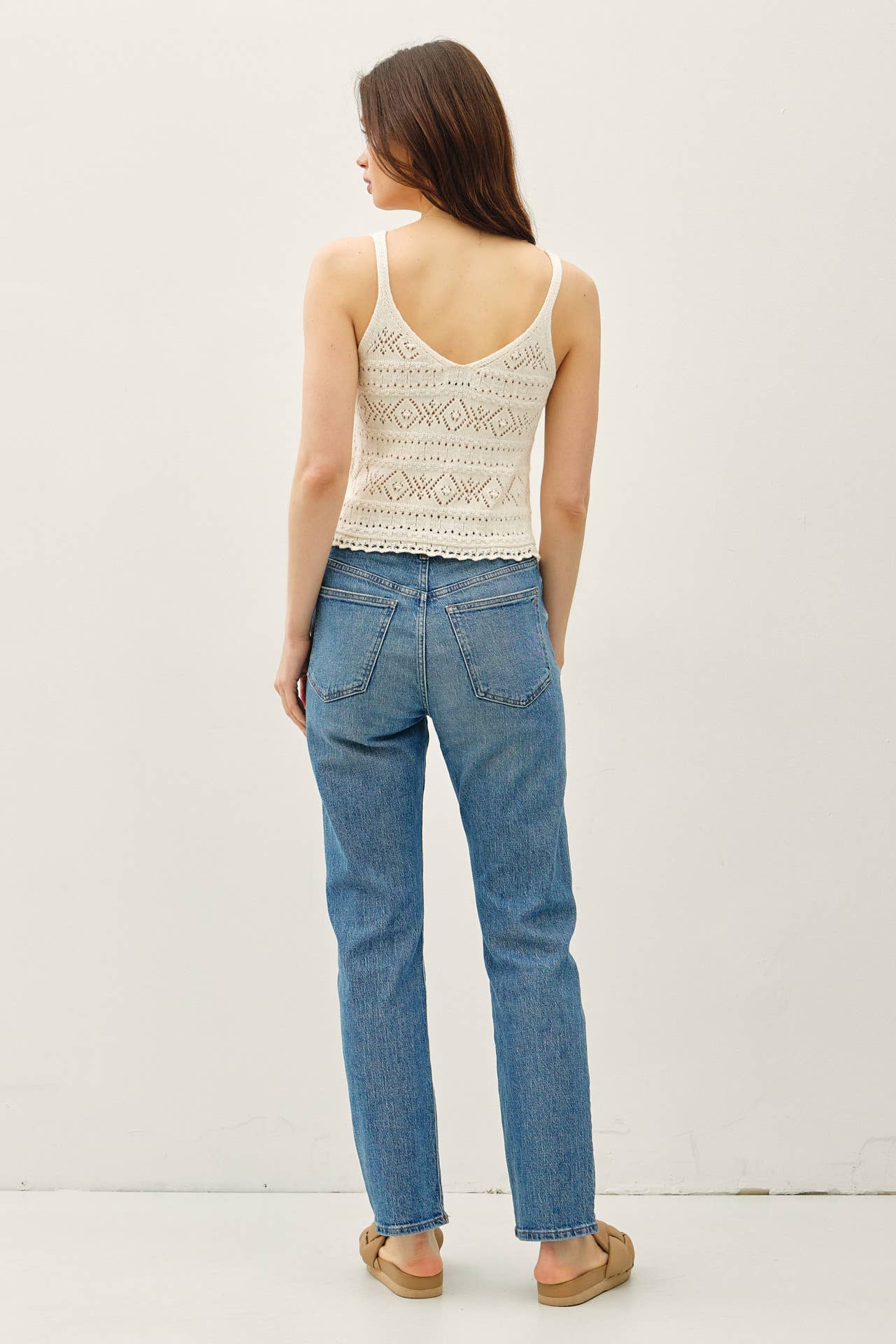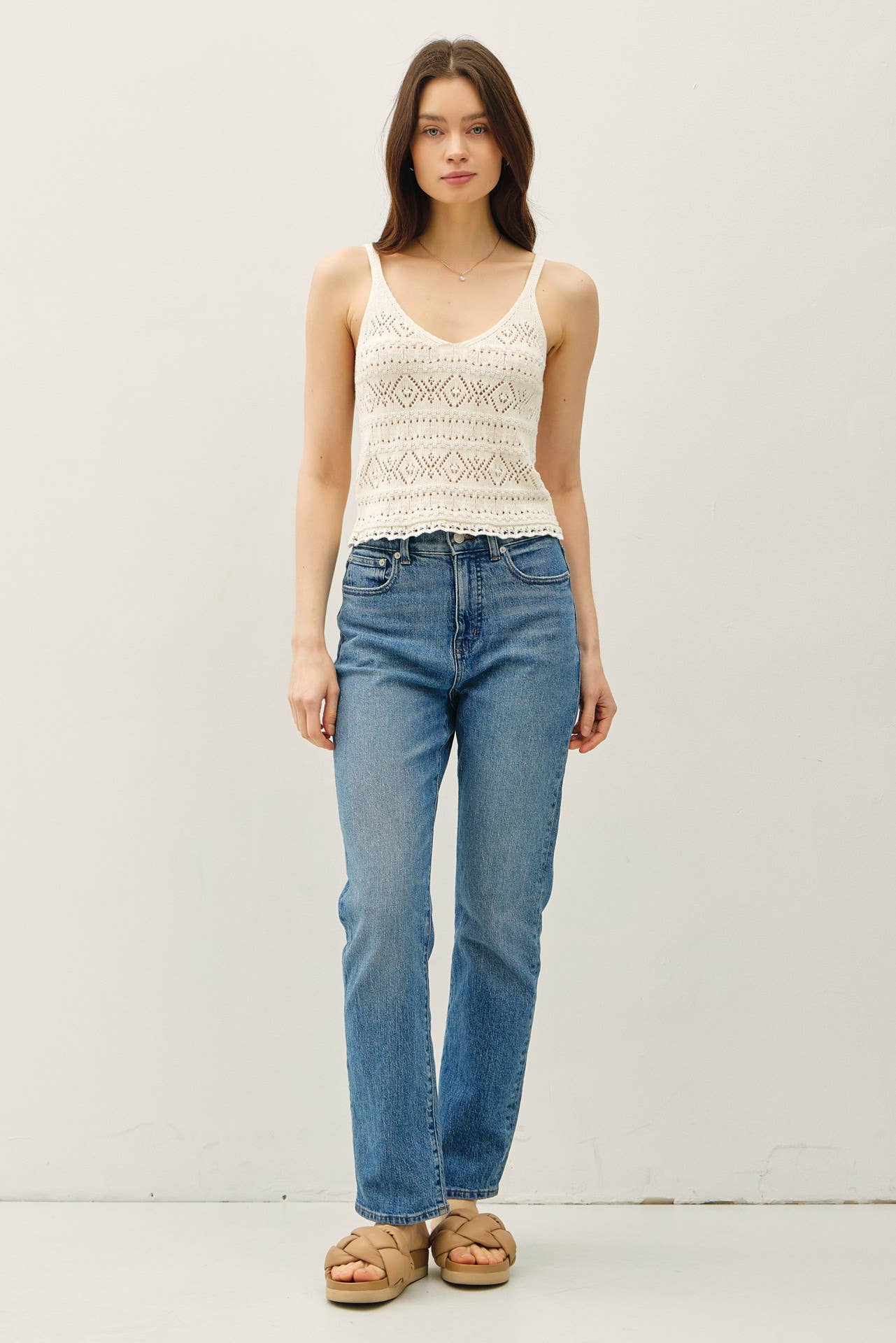 THIS BREEZY, CROCHET KNIT TANK FEATURES A BEAUTIFUL KNIT PATTERN, SCALLOPED HEMLINE, & FLATTERING CROPPED CUT