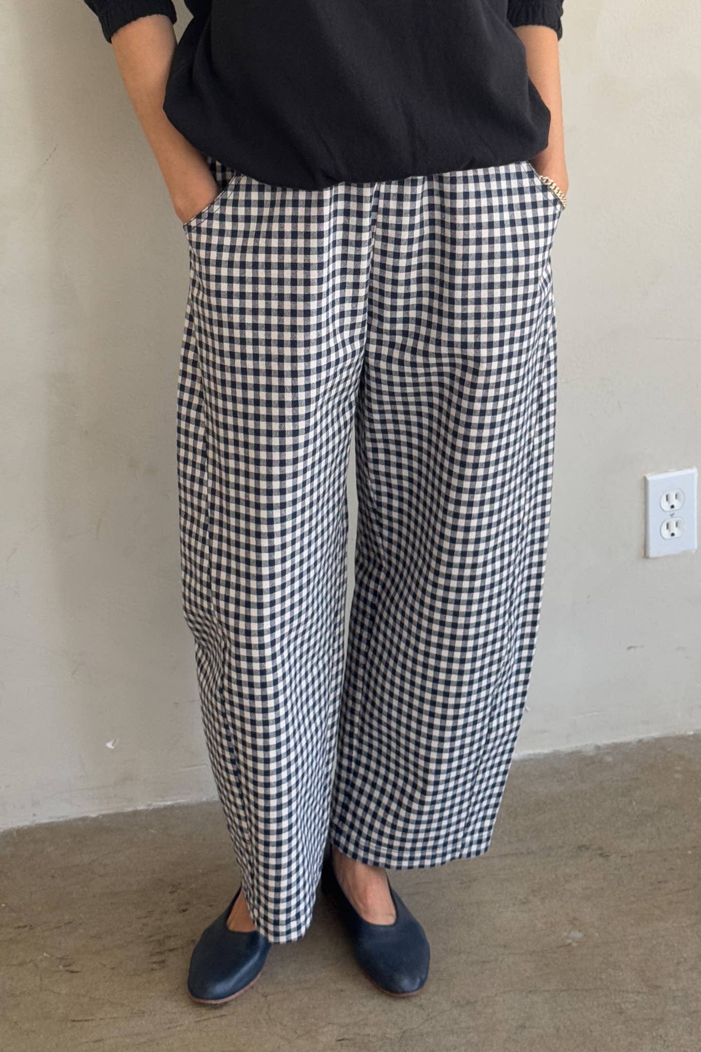 Why We Made This? These are the pants we love to live in! She has thoughtful design details like an elastic high waist that gives you a room to breath, slightly curved leg shape, cropped length to show off your favorite socks and shoes, unique side panels and deep pockets. The heavy-weight canvas material likely adds durability and gives them a structured look. The Arc pants would make a great addition to everyone's wardrobe and complement to all the Le Bon Shoppe pieces you own! Approximate Measurements: Small: Waist 12”(relaxed/flat - Denim size 24"-26"), Hip 22 1/2", Front Rise 11", Inseam 25 1/2”, Leg opening 8 1/2" Medium: Waist 13”(relaxed/flat - Denim size 26"-28"), Hip 23 1/2", Front Rise 11 1/4", Inseam 25 3/4”, Leg opening 8 3/4" Large: Waist 14”(relaxed/flat - Denim size 28-30"), Hip 24 1/2', Front Rise 11 1/2", Inseam 26”, Leg Opening 9" CONTENTS : 100% Cotton Model is 5' 6", 110 lbs and wearing a size small Made in South Korea