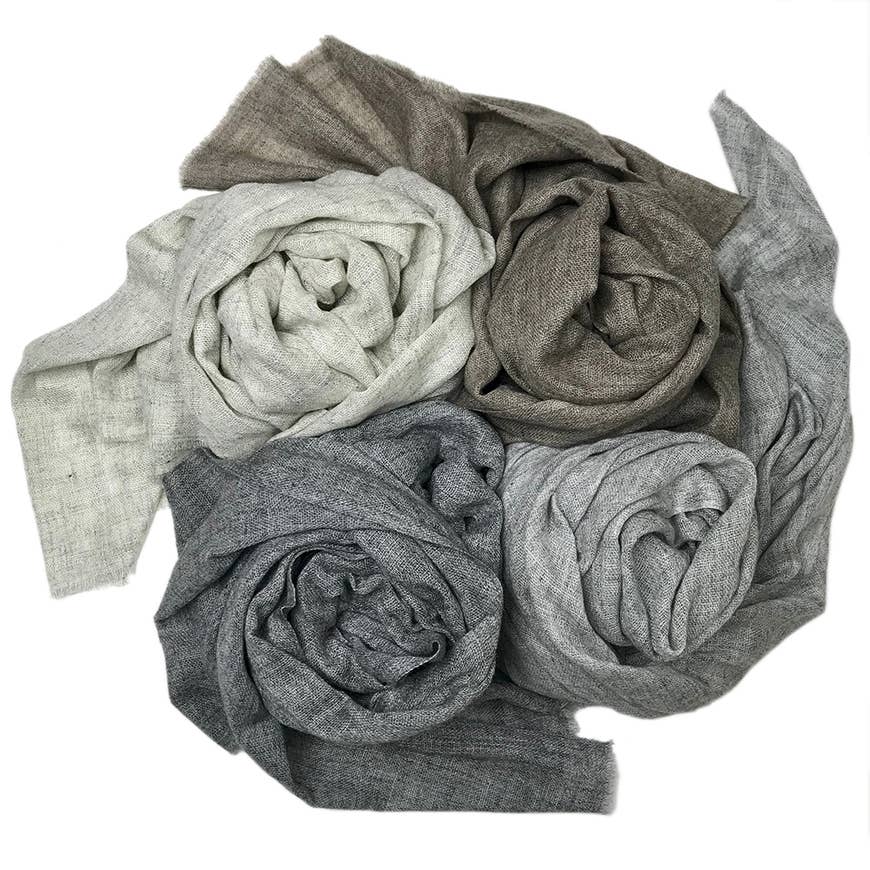 Wrap yourself in cashmere! These gauze cashmere scarves can be worn multiple ways and are the perfect accessory for layering on cold evenings. They are delicately soft against your skin and the modern prints are handmade on traditional looms. These timeless scarves make great gifts and employ weavers in Nepal. Material: 100% Handloomed Himalayan Cashmere. Color: Heathered Cream. Measurements: 28" x 80"- 86"