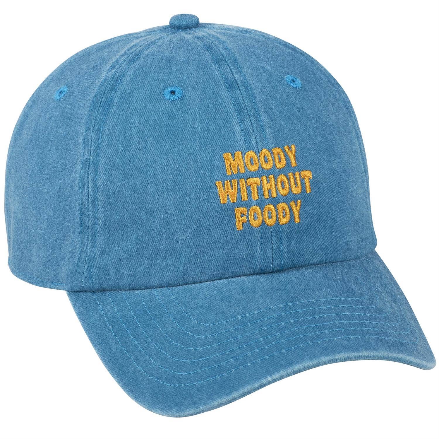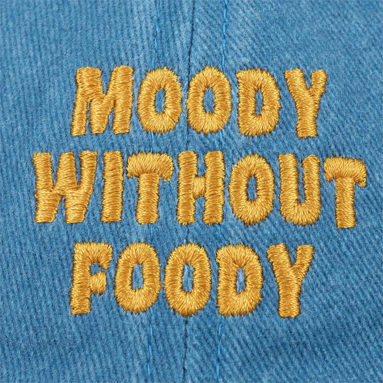 Give fair warning that snacks must be available at all times when wearing this blue baseball displaying a fun honest sentiment that reads "Moody Without Foody." Moody sentiment is fully embroidered on stonewashed cotton that gives this casual everyday hat a naturally worn look. Questionables baseball caps are one size fits most with an adjustable metal buckle to create the perfect fit. Hand wash only. Our Moody Without Foody baseball cap is perfect for everyday expression and letting everyone know a little, or a lot, about yourself.