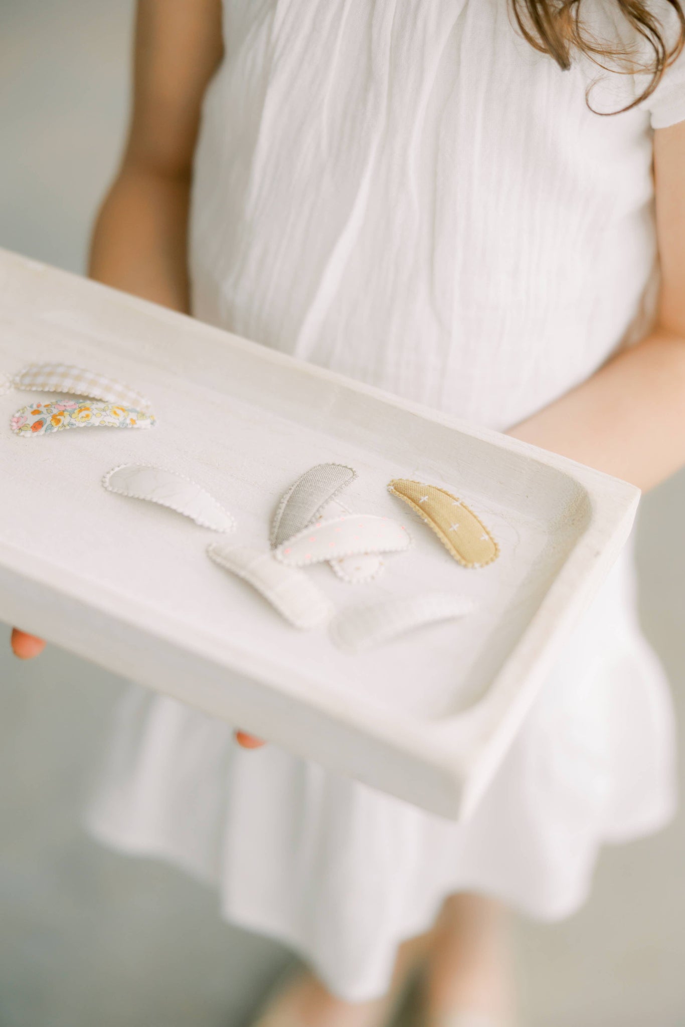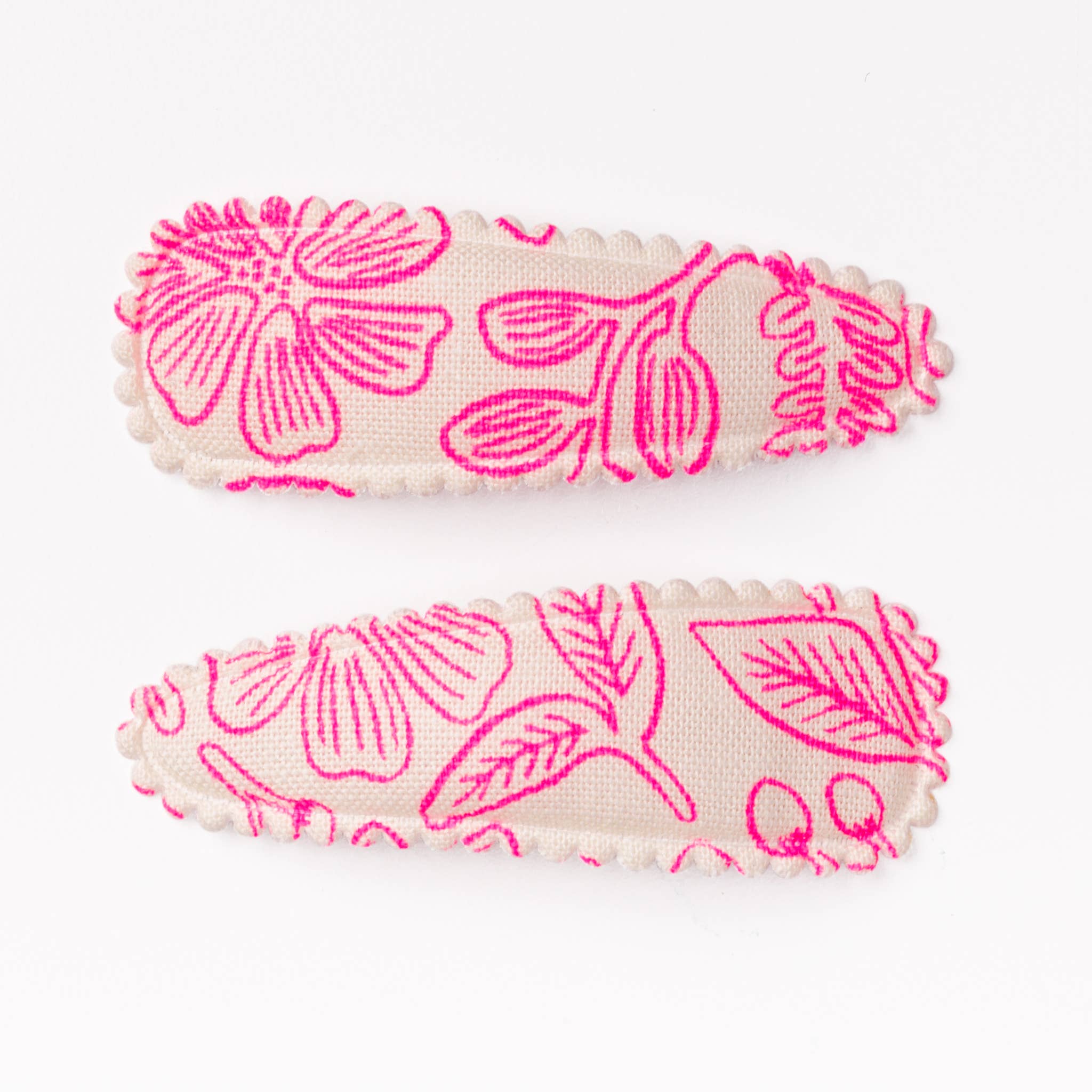 A beautiful set of fabric covered snap clips featuring a scalloped edge detail. Soft, comfortable and easy to wear. Our pretty hair clips are perfect for any age from toddler to adult. This hair clip set features beautiful high quality Rifle Paper Co. fabric with hot pink floral details.