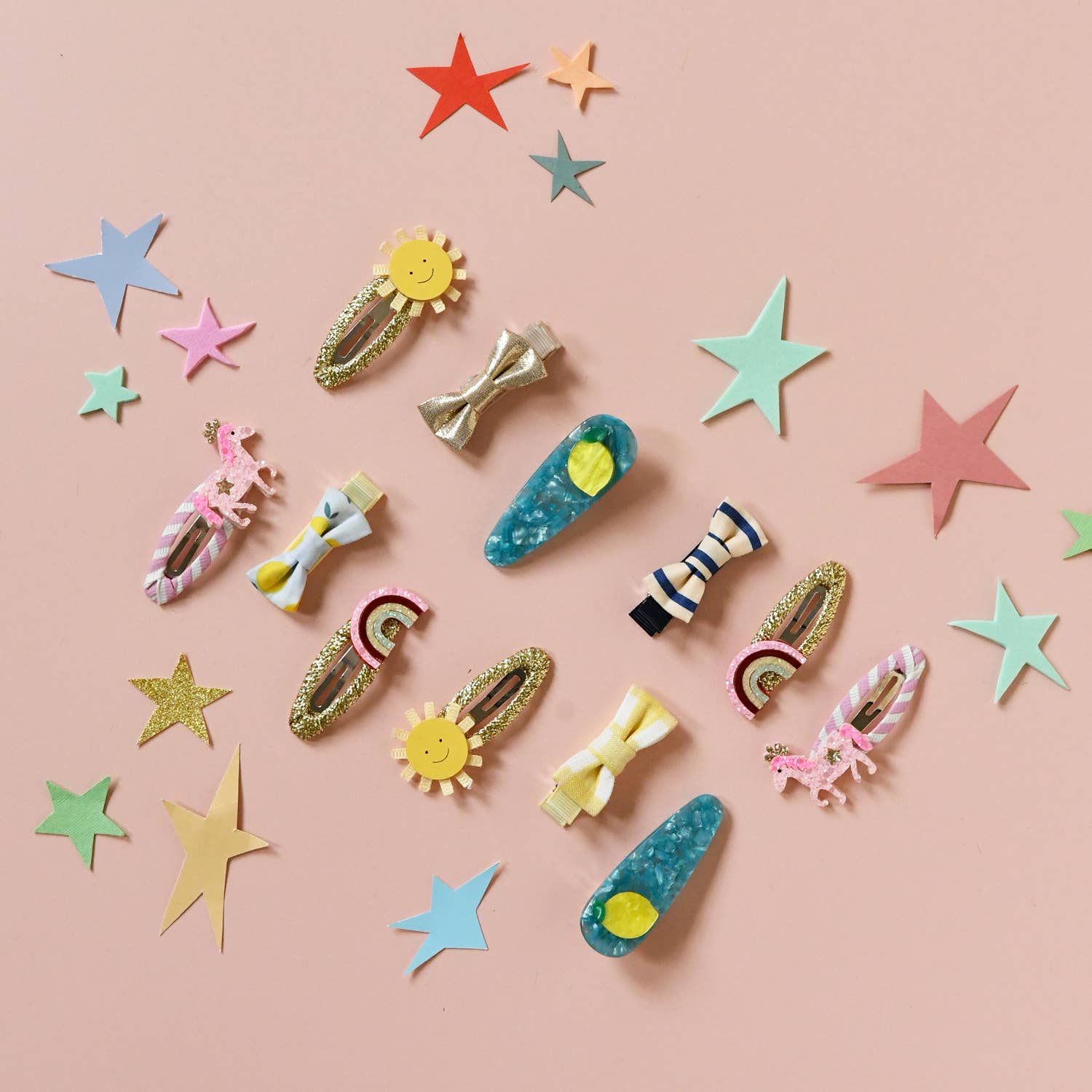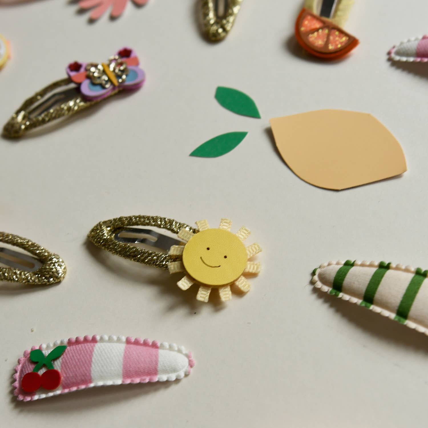 Cheerful little suns adorn these glittery gold ribbon wrapped clips! Each smiling sun has beaming grosgrain ribbon rays and a smiling face on a PU centre. The perfect clips for a day full of sunshine!